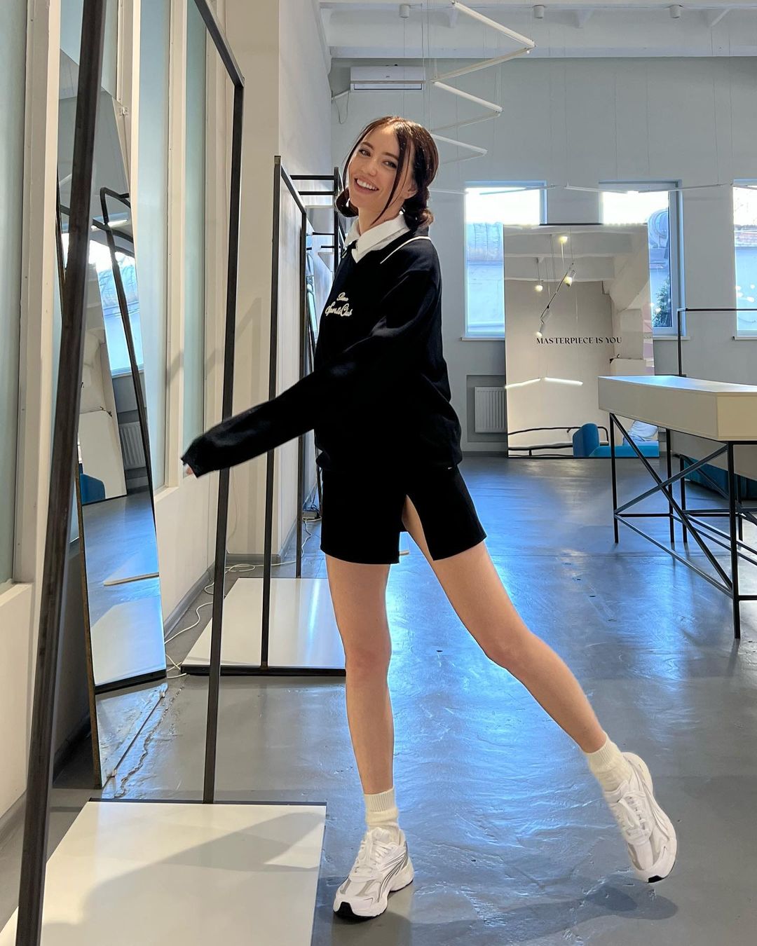 Перед камерою знаменитість постала у новому трендовому образі. Вона обрала коротку спідницю з ефектним розрізом, светр розміру оверсайз, підібраний у тон до спідниці, а також класичну білу сорочку, яку доповнила брошкою. Завершили сміливий образ зібране волосся, легкий макіяж та спортивне взуття.
