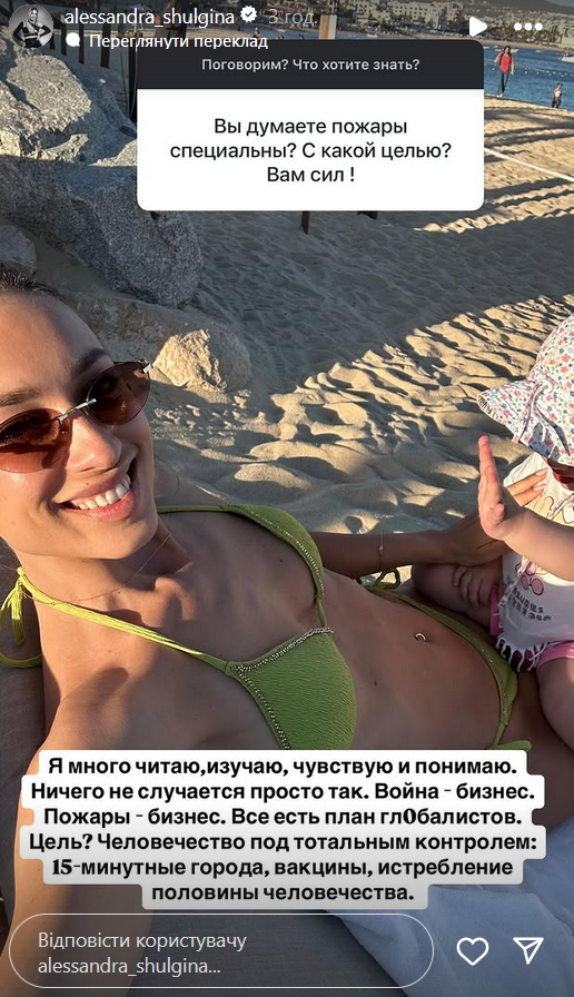 "Я багато читаю, вивчаю, відчуваю і розумію. Нічого не трапляється просто так. Війна - бізнес. Пожежі - бізнес. Усе є план глобалістів. Мета? Людство під тотальним контролем: 15-хвилинні міста, вакцини, винищення половини людства", - висловилася Шульгіна, яка називає себе "мотиваційною ораторкою".