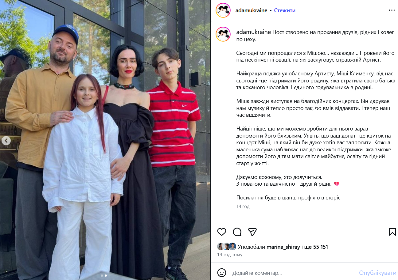 "Найкраща подяка улюбленому Артисту, Міші Клименку, від нас сьогодні - це підтримати його родину, яка втратила свого батька та коханого чоловіка. І єдиного годувальника в родині. Міша завжди виступав на благодійних концертах. Він дарував нам музику й тепло просто так, бо вмів віддавати. І тепер наш час віддячити", - йдеться в дописі.