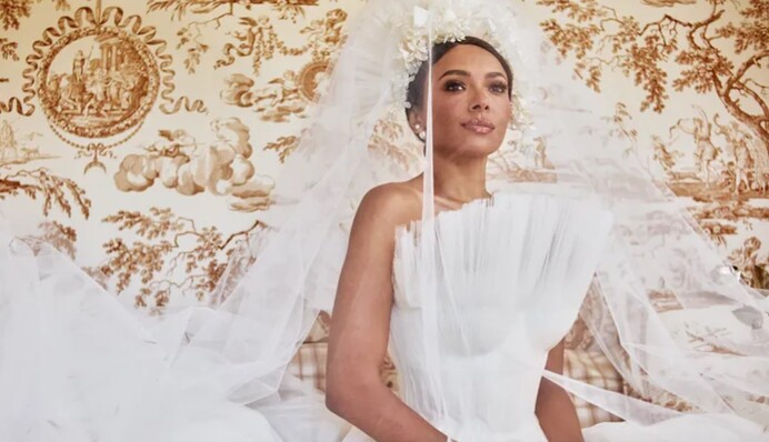 Наречена обрала сукню від Jean Paul Gaultier із квітковим акцентом на головному уборі та прикрасила образ перловими сережками, а наречений – у вбранні індійського дизайнера Анаміки Кханни.