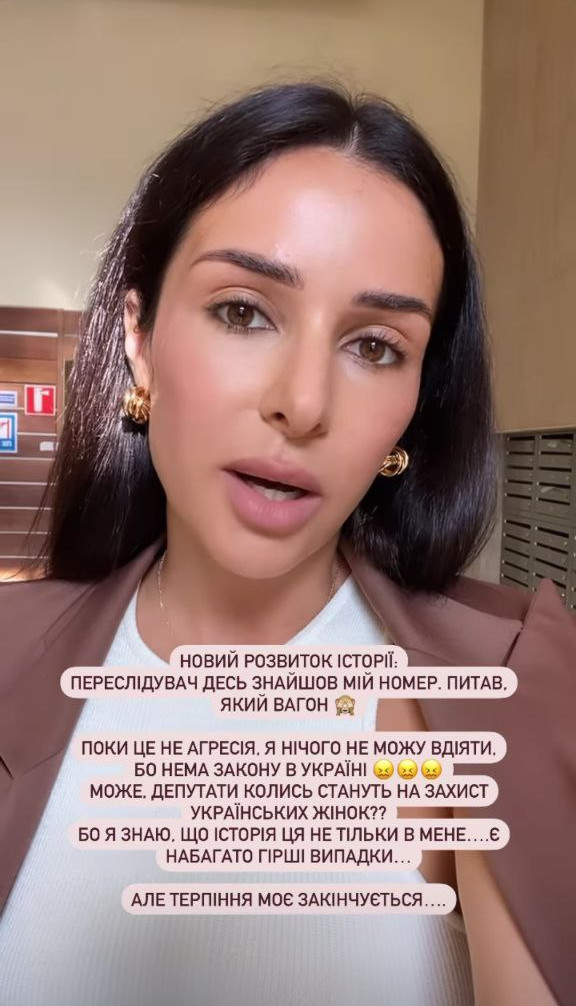 "Історія з переслідувачем продовжується. Сьогодні вранці він мені дзвонив, десь знайшов мій номер, питав, який у мене вагон і казав, що "викликане таксі, щоб мене відвезти". Я не в шоці, бо я вже звикла, таких людей багато. Я поки нічого не роблю з цим, тому що він не агресивний, але він надзвонює до консьєржа мого будинку і запитує, коли я повернуся і чи вдома я. У мене ще трохи побуде терпіння, але потім воно закінчиться, і будуть дії", - заявила Злата в Instagram-сторіз.