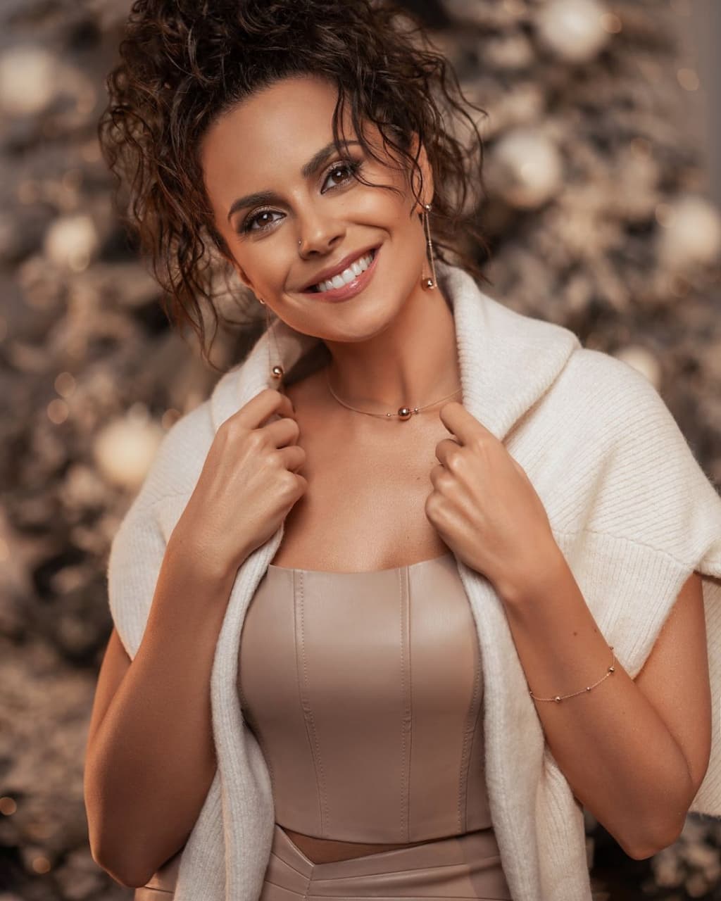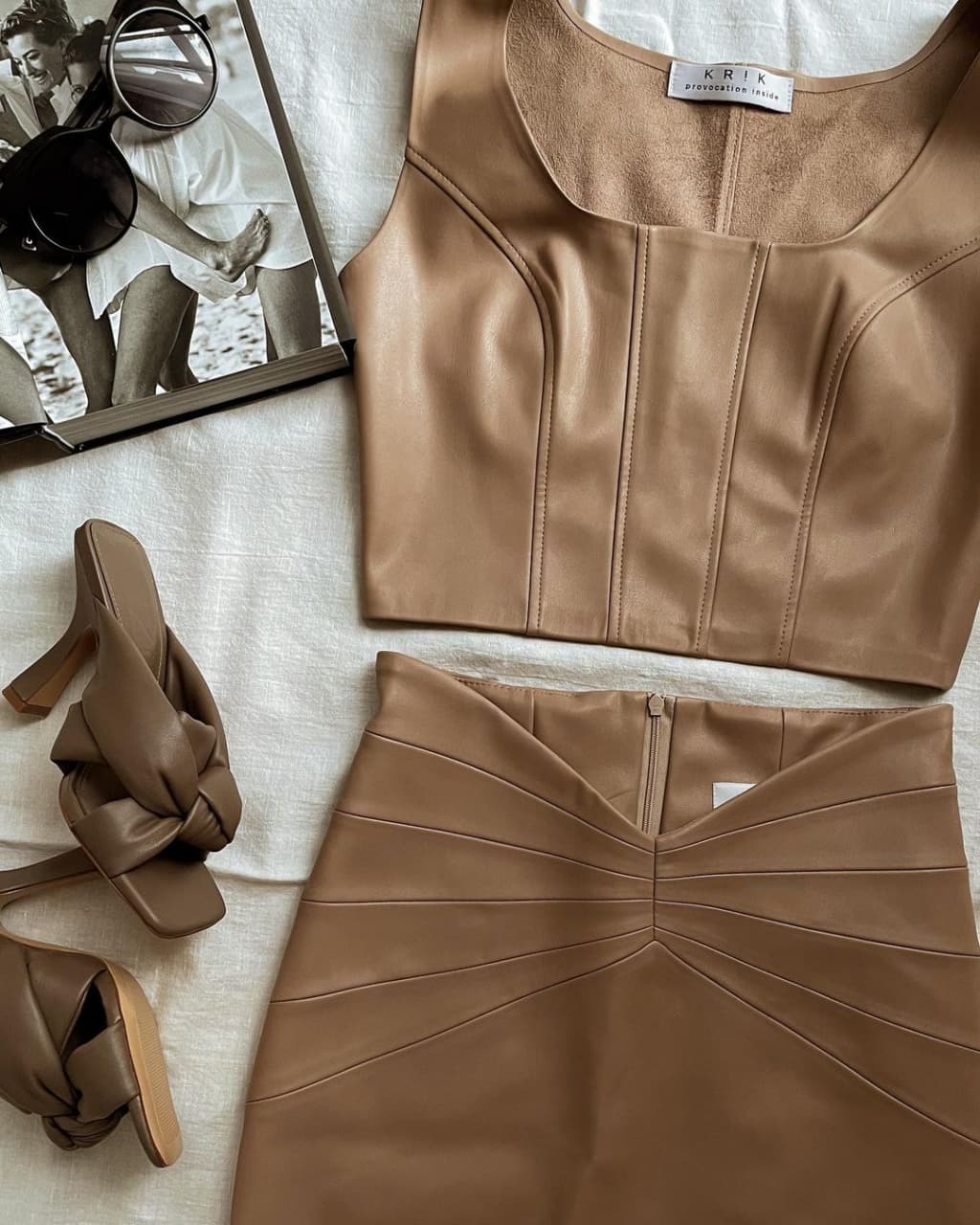 На знімку з відпустки у Мексиці Каменських позувала у коричневій міні-спідниці зі штучної шкіри. Модель із завищеною талією та оригінальним клиноподібним поясом підкреслила стегна зірки. У комплекті зі спідницею Настя вдягла короткий шкіряний топ. Модний образ завершили високі білі чоботи із принтом у вигляді зміїної шкіри.