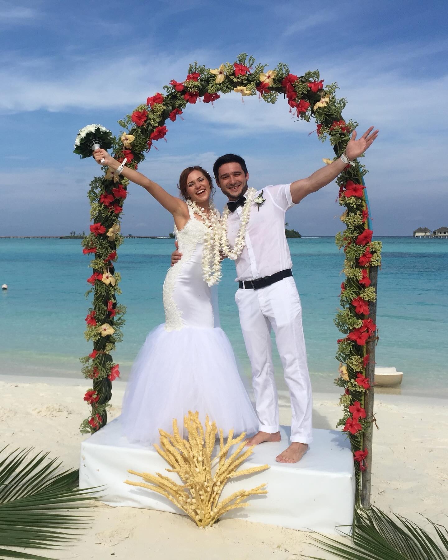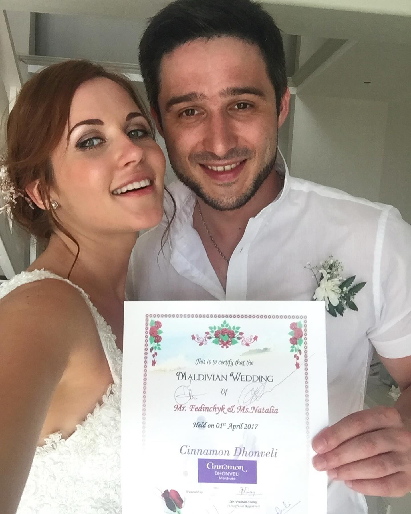Акторка Наталка Денисенко святкує 7-му річницю шлюбу зі своїм чоловіком Андрієм Федінчиком, який наразі є військовослужбовцем. У соцмережах вона поділилася серією архівних фото, зроблених під час їхньої весільної церемонії на Мальдівах.