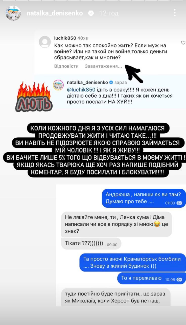 Чоловік Наталки Денисенко Андрій Федінчик нині служить у ЗСУ. Нещодавно актриса розповіла, як переживає розлуку з коханим, якого не бачила із грудня. Не всіх користувачів мережі переконали її слова. В Instagram-історіях Денисенко показала, як хейтери звинувачують її у "занадто спокійному житті".