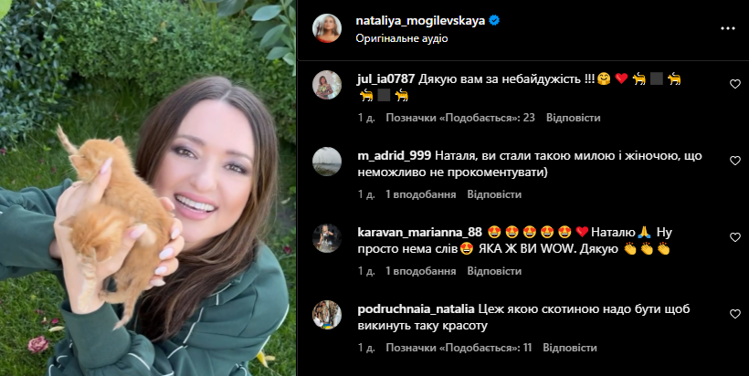 На сторінці в Instagram знаменитість оприлюднила чарівні кадри, на яких її донька дивиться на маленьких кошенят у коробці, а згодом гладить їх у траві. Наталія уточнила, що вісім беззахисних малюків вони побачили біля магазину. Співачка вирішила подбати про котиків, а коли вони підростуть, знайти для них хороших господарів.