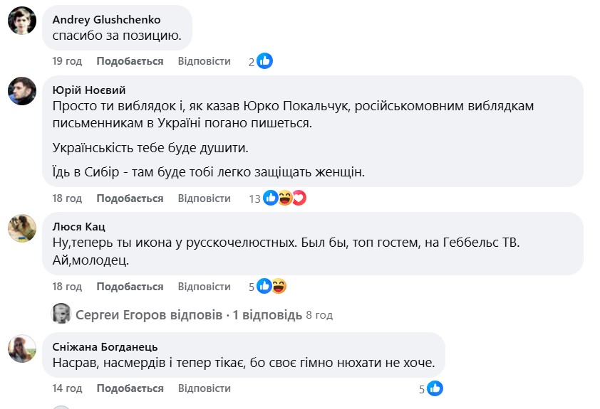 "Насрав, насмердів і тепер тікає, бо своє гімно нюхати не хоче", "Просто ти ви*лядок і, як казав Юрко Покальчук, російськомовним ви*лядкам письменникам в Україні погано пишеться. Українськість тебе буде душити. Їдь в Сибір - там буде тобі легко защіщать женщін", - пишуть коментатори.