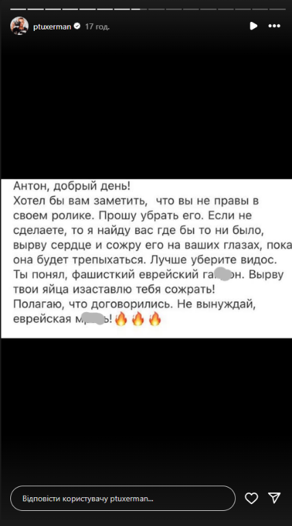"Антоне, добрий день! Хотів би вам зауважити, що ви не праві у своєму ролику. Прошу прибрати його. Якщо не зробите, то я знайду вас, де б то не було, вирву серце і зжеру його на ваших очах, поки вона буде тріпотіти. Краще приберіть відос…".
