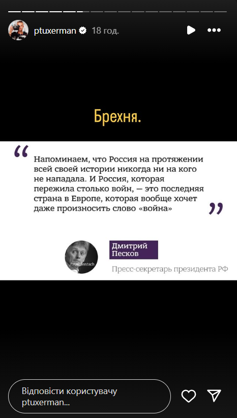 Скриншот цього повідомлення Птушкін опублікував у контексті брехні та її наслідків. За брехню він додав слова прессекретаря путіна Дмитра Пєскова щодо того, що "Росія протягом своєї історії ніколи ні на кого не нападала… що це остання країна, яка взагалі хоче навіть вимовляти слово війна".
