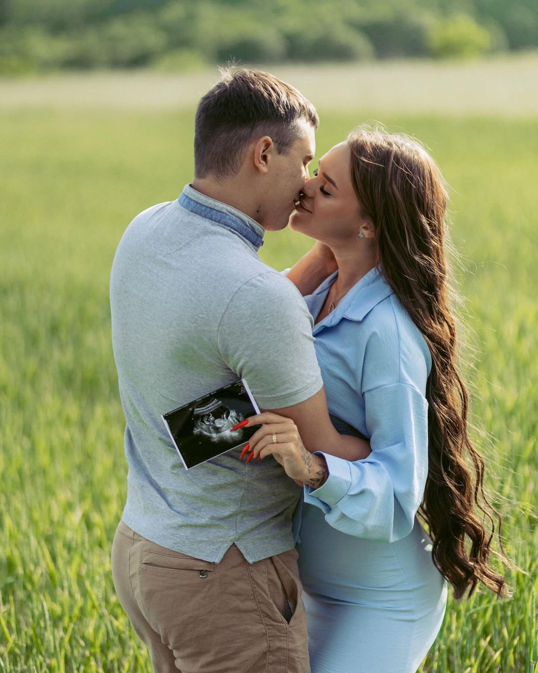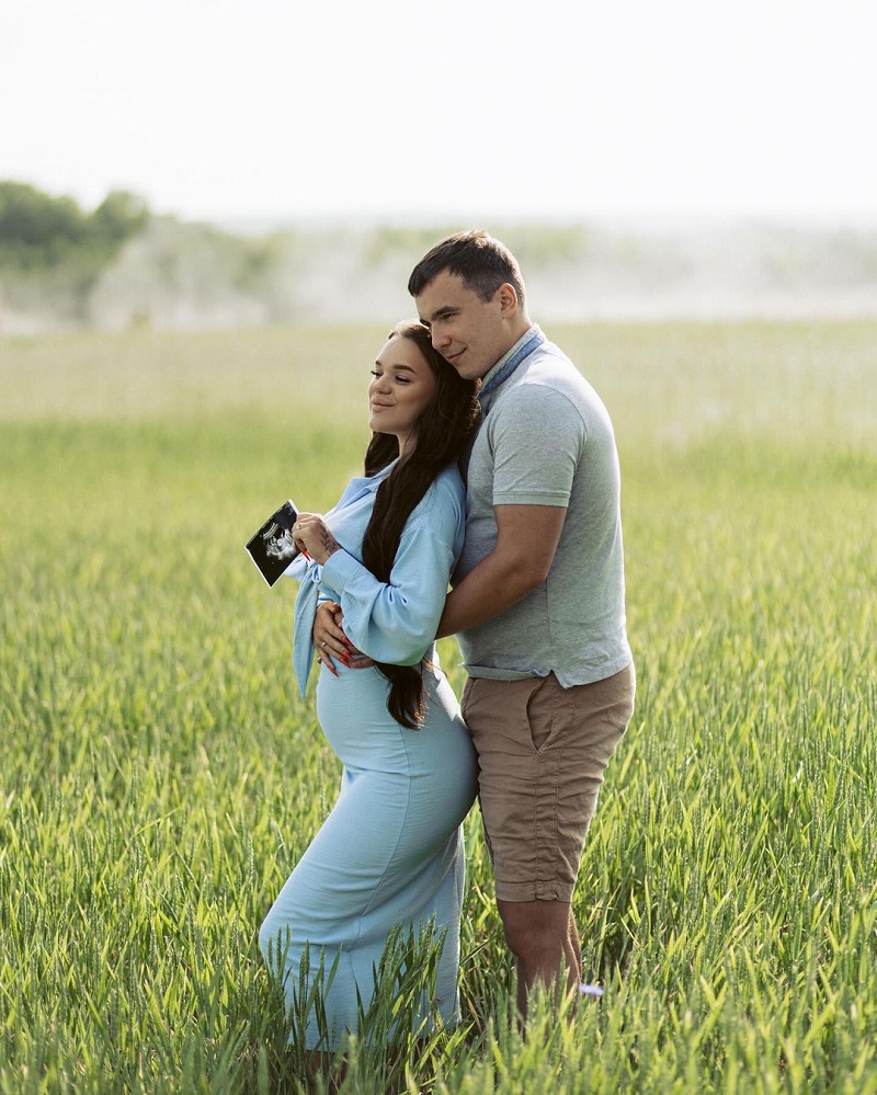 На одній зі світлин Юлія обіймає свого хлопця, а в руках у неї кадр УЗД. Юлія Верба позувала також на полі. Жінка була в легкій сукні ніжно-блакитного кольору, а Костянтин – у сірій футболці та шортах коричневого кольору.