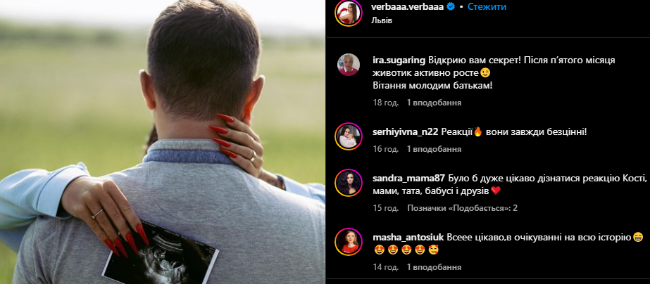 На своїй сторінці в Instagram 21-річна Верба поспілкувалася з підписниками, для яких новина про вагітність стала неочікуваною. Дівчина розмістила світлину зі своїм коханим Костянтином.