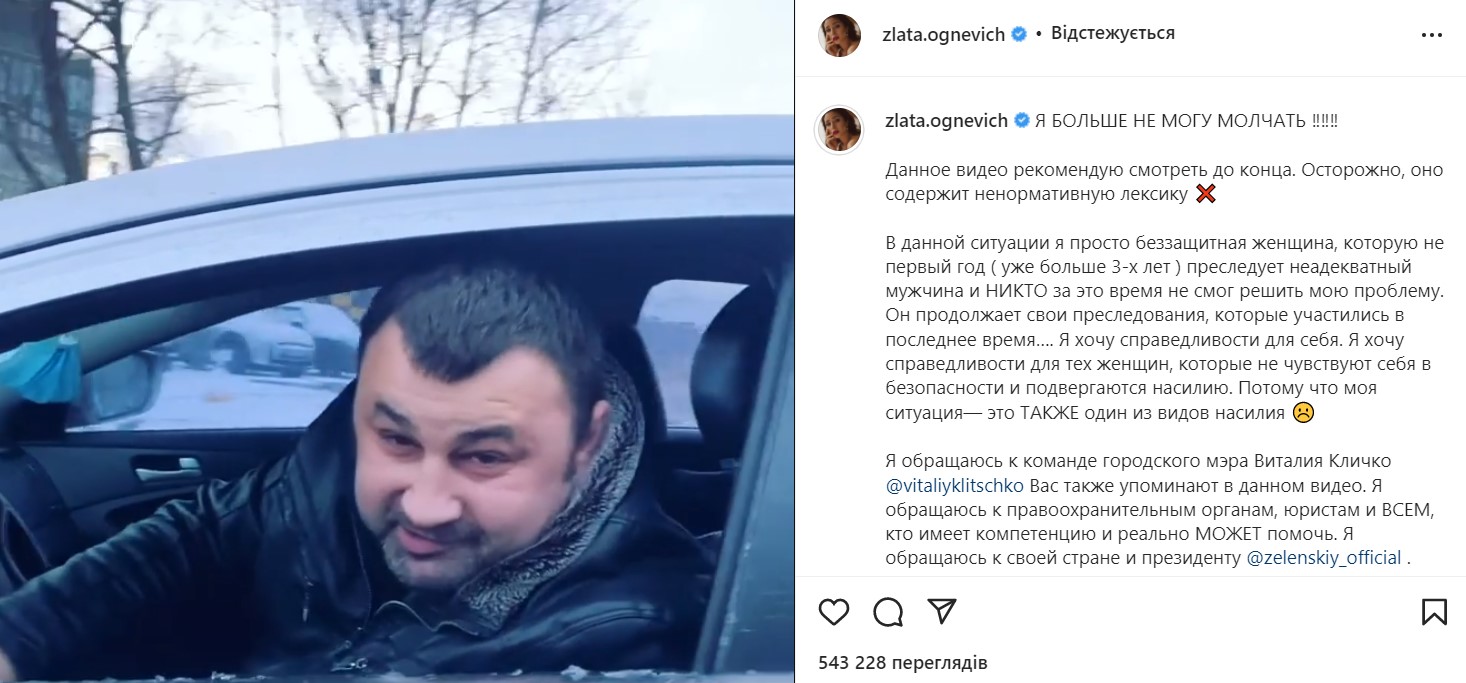 "Ця людина дійсно переслідує мене. Це триває дуже-дуже багато років. На жаль, я ніяк не могла на нього вплинути до сьогоднішнього дня. Він у цьому відео вже настільки знахабнів... Він погрожує моїм близьким, мені. Я не відчуваю себе у безпеці. Я не можу вийти ввечері нікуди. Все, він свого добився. Я заходжу додому на свій майданчик, і заглядаю, чи не стоїть там переслідувач", - заявила Огнєвіч.