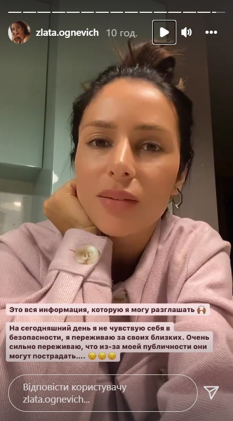 Українська співачка Злата Огнєвіч зізналася, що після зустрічі з переслідувачем боїться виходити ввечері одна на вулицю. Раніше вона показала, як чоловік на ім'я Вадим Лебідь погрожує, що "завалить" її чи її батька Леоніда Бордюга.