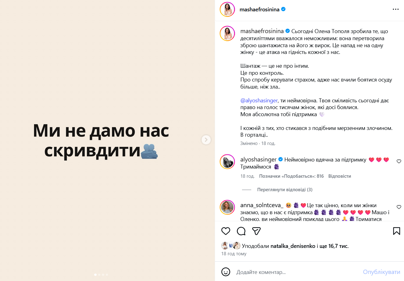 Телеведуча і громадська діячка Маша Єфросиніна публічно підтримала Олену Тополю на тлі скандалу з шантажем і поширенням інтимних відео. Вона також звернулася до інших жінок, які опинилися в подібній ситуації, із важливим закликом не мовчати.