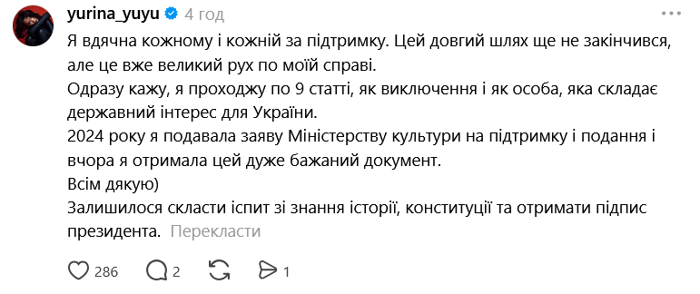 У Threads Юріна уточнила, що подала документи за статтею 9 як виняток - як особа, яка становить державний інтерес для України.