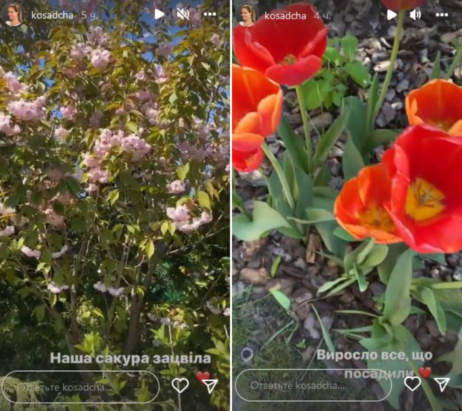 Телеведуча опублікувала в Instagram фотографії квітучого саду та розповіла, що цього року вперше зацвіла сакура. Також знаменитість не може намилуватися тюльпанами, які до її повернення додому розпустили свої бутони. Подробиць вона розповідати не стала, але зважаючи на все, окупанти не зачепили її будинок.