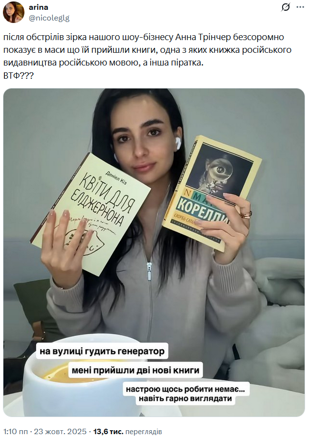 "Після обстрілів зірка нашого шоу-бізнесу Анна Трінчер безсоромно показує в маси що їй прийшли книги, одна з яких книжка російського видавництва російською мовою, а інша піратка", - зазначила користувачка Х.