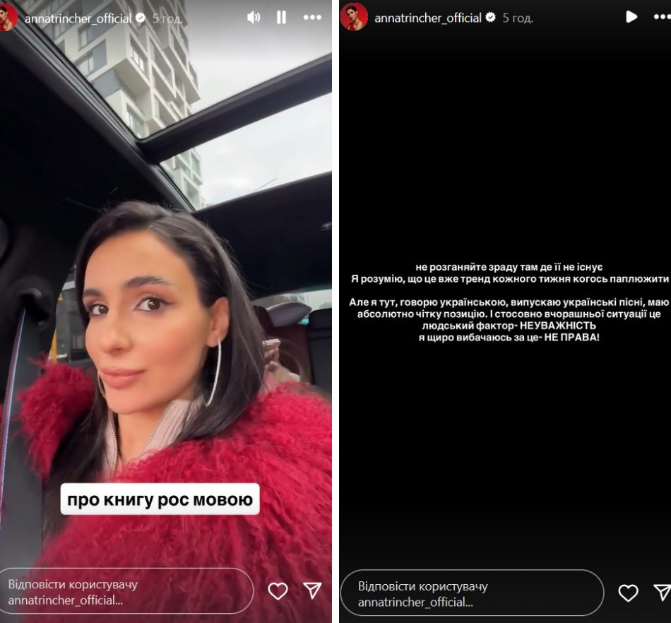 Наступного дня Трінчер вийшла в "сторіз" із поясненнями. Співачка заявила, що книгу замовляла її асистентка, а вона, зі свого боку, не помітила, що видання надруковане російською. Анна запевнила, що після початку повномасштабної війни читає виключно українською.