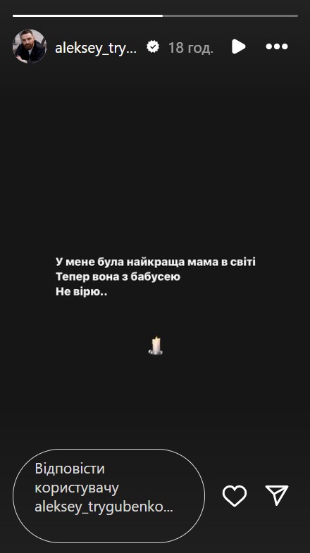 Трагічну звістку чоловік розповів у Instagram-stories. Він оприлюднив публікацію, у якій написав, що його мама "була найкращою у світі". Інші подробиці чи причину смерті Тригубенко уточнювати не став. "В мене була найкраща мама у світі. Тепер вона з бабусею… Не вірю", - йдеться у пості Олексія.