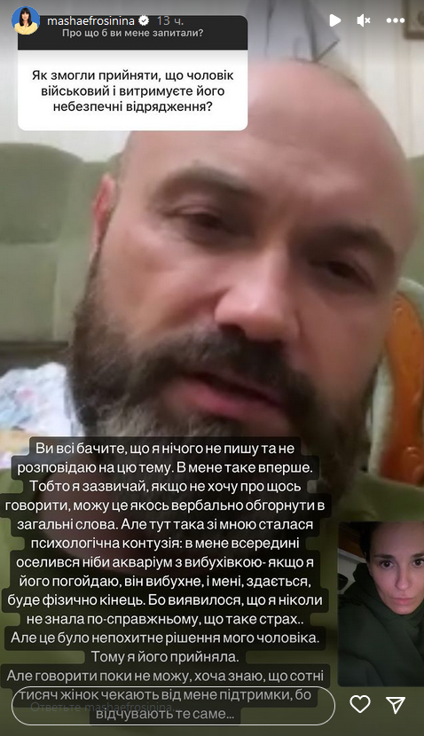 "Ви всі бачите, що я нічого не пишу та не розповідаю на цю тему. У мене таке вперше. Тобто я зазвичай, якщо не хочу про щось говорити, можу це якось вербально обгорнути в загальні слова. Але тут така зі мною трапилася психологічна контузія: у мене всередині оселився ніби акваріум з вибухівкою - якщо я його погойдаю, він вибухне, і, мені здається, буде фізично кінець. Бо виявилося, що я ніколи не знала по-справжньому, що таке страх", - описала свій стан Єфросиніна.