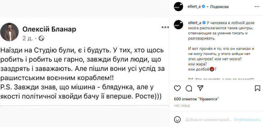"У людини в лобовій частині мозку розташовуються такі центри, які відповідають за вміння писати і розмовляти. І ось прочитав я те, що він написав і не можу зрозуміти, у цього альоші немає цих центрів? або немає мозку? або спека? або довб**б?". "Хтось росте, а хтось падає", - додав Еллерт.