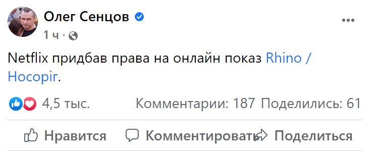 Про це на своїй сторінці у Facebook написав сам Сенцов: "Netflix придбав права на онлайн показ Rhino/Носоріг", - йдеться у його публікації.