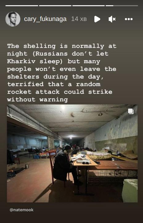"Обстріли зазвичай відбуваються вночі (росіяни не дають Харкову спати), але багато людей не покидають сховища навіть вдень. Вони бояться, що хаотична ракетна атака може статися без попередження", - написав режисер.