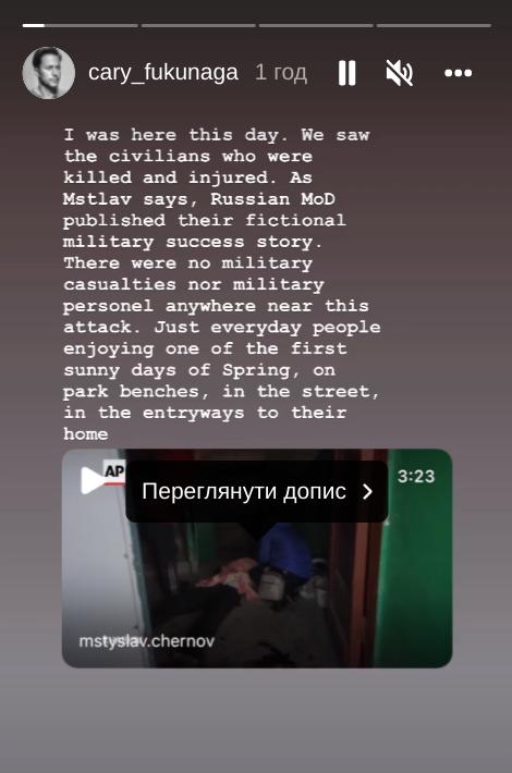 "Я був там того дня. Ми бачили вбитих і поранених цивільних. Міноборони РФ опублікував вигадану історію про військовий успіх. Там не було військових втрат, як і не було військовослужбовців. Просто звичайні люди, які насолоджувалися першими сонячними весняними днями на лавках у парку, на вулиці, дорогою додому", - написав Фукунага в Instagram-історіях.