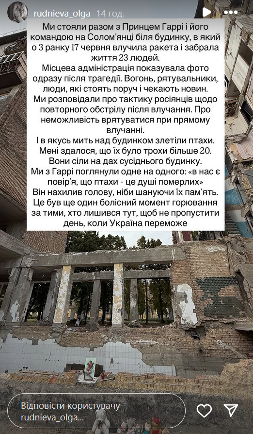 "Ми стояли разом з принцом Гаррі і його командою на Солом'янці біля будинку, в який о 3 ранку 17 червня влучила ракета і забрала життя 23 людей. Місцева адміністрація показувала фото одразу після трагедії. Вогонь, рятувальники, люди, які стоять поруч і чекають новин. Ми розповідали про тактику росіян щодо повторного обстрілу після влучання. Про неможливість врятуватися при прямому влучанні. І в якусь мить над будинком злетіли птахи. Мені здалося, що їх було трохи більше 20. Вони сіли на дах сусіднього будинку. Ми з Гаррі поглянули одне на одного: "В нас є повір'я, що птахи - це душі померлих". Він нахилив голову, ніби шануючи пам'ять. Це був ще один болісний момент горювання за тими, хто лишився тут, щоб не пропустити день, коли Україна переможе", - розповіла Ольга Руднєва у себе в Instagram.