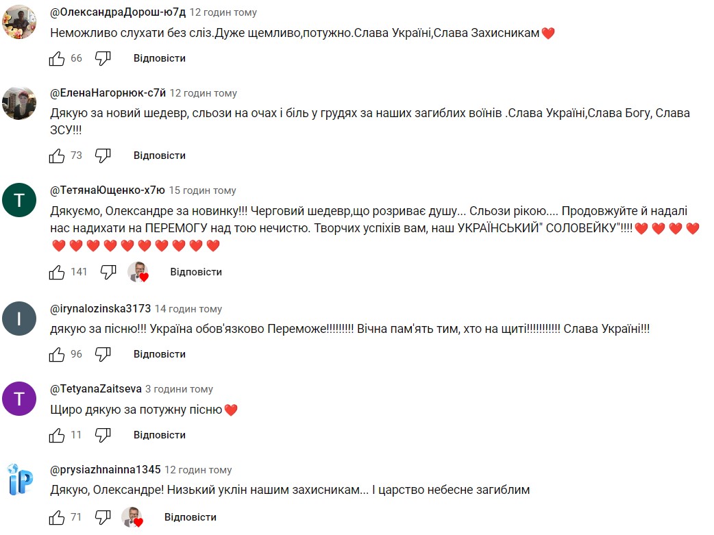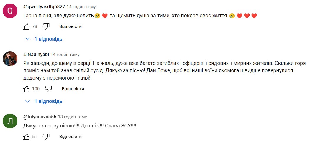 "Гарна пісня, але дуже болить", "Неможливо слухати без сліз. Дуже щемливо, потужно. Слава Україні, Слава Захисникам", "Черговий шедевр, що розриває душу... Сльози рікою.... Продовжуйте й надалі нас надихати на ПЕРЕМОГУ над тою нечистю", пишуть коментатори.
