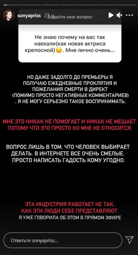 Про це дівчина розповіла в своїх "сторіз". "Але навіть задовго до прем'єри я отримую щоденні прокляття та побажання смерті в директ (крім просто негативних коментарів)", - зізналася акторка.