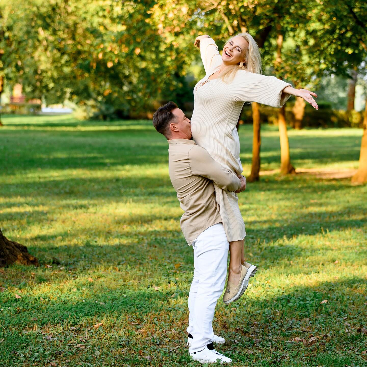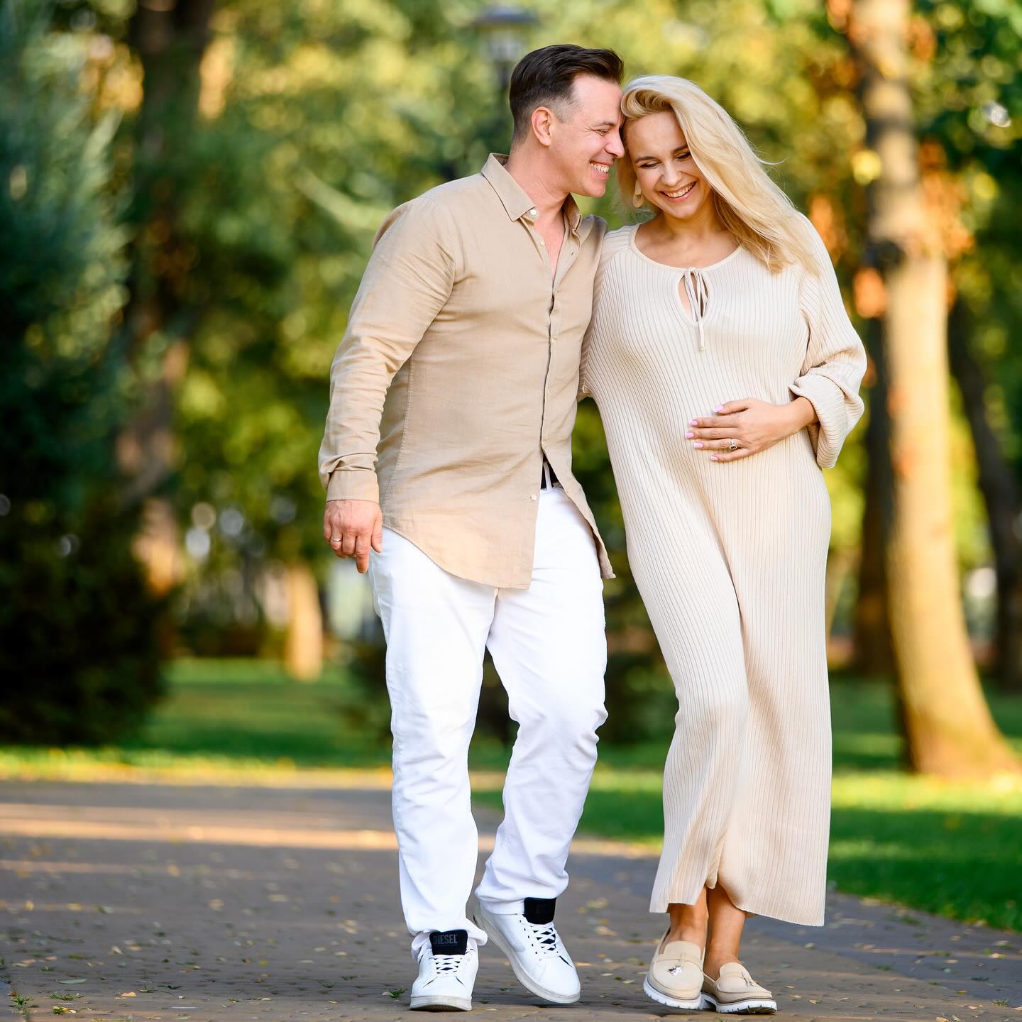 Ребрик обрала для родинної фотосесії бежеву сукні вільного крою, яка підкреслила її животик, а також взуття на низькому ходу. На одному із фото обранець знаменитості, танцівник Андрій Дикий, підняв Лілію та ніжно поцілував її в животик.