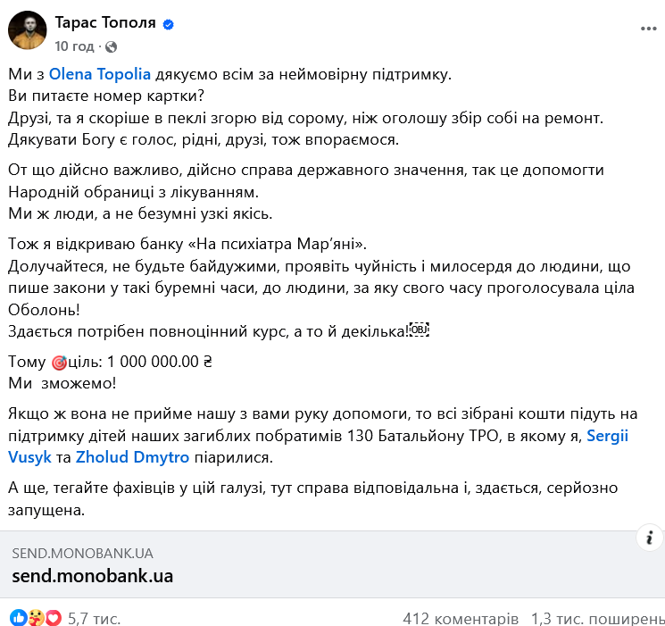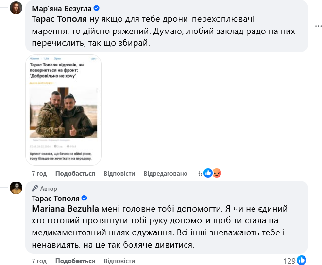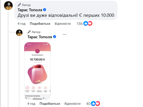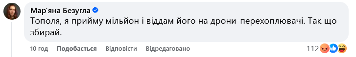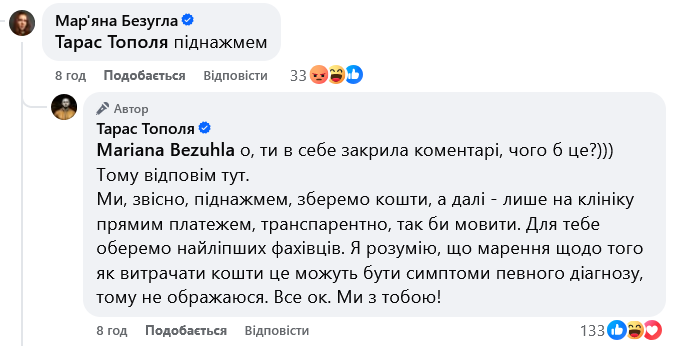 У коментарях Тарас Тополя висловив вдячність "відповідальним" українцям, які за кілька годин задонатили 10 тисяч. Мар'яна Безугла у відповідь закликала "піднажати", а також заявила, що "прийме мільйон", але гроші використає для інших цілей.