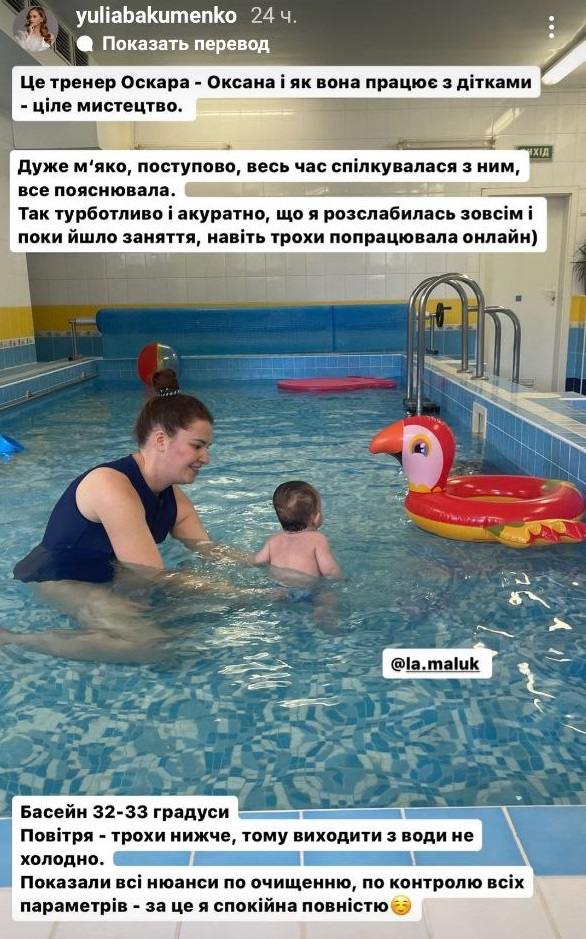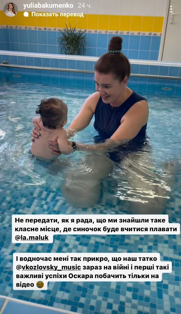 "Не передати, як я рада, що ми знайшли таке класне місце, де синочок навчатиметься плавати. І водночас мені так прикро, що наш татко на війні та перші такі важливі успіхи Оскара побачить лише на відео", - зазначила дружина співака.