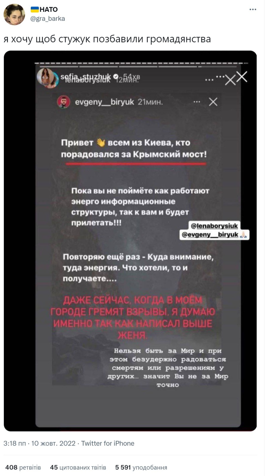 Свого часу Софія Стужук була однією з найпопулярніших Instagram-блогерок України: у соціальній мережі на неї було підписано понад 5 млн осіб. Стужук неодноразово провокувала скандали запереченням користі вакцинації, популяризацією нетрадиційної медицини та небезпечною ідеєю домашніх пологів. Тепер Стужук остаточно розлютила українців своєю зловтіхою щодо ракетних ударів по Києву.