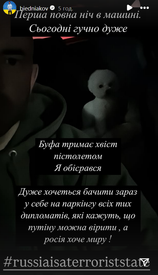 "Перша повна ніч машині. Сьогодні дуже гучно. Буфа тримає хвіст пістолетом. Я обіср*вся, - поділився у "сторіз" телеведучий. - Дуже хочеться бачити зараз у себе на паркінгу всіх тих дипломатів, які кажуть, що Путіну можна вірити, а Росія хоче миру!".