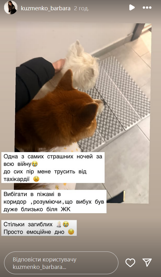 "Одна з самих страшних ночей за всю війну. До сих пір мене трусить від тахікардії. Вибігати в піжамі в коридор, розуміючи, що вибух був дуже близько біля ЖК, - розповіла в Instagram-історіях донька Кузьми Скрябіна. - Стільки загиблих. Просто емоційне дно".