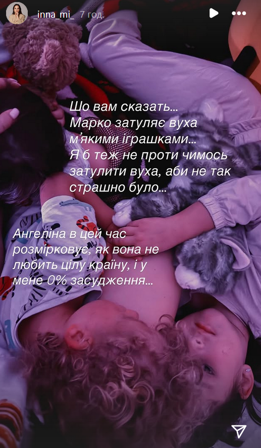 "Шо вам сказать… Марко затуляє вуха м'якими іграшками... Я б теж не проти чимось затулити вуха, аби не так страшно було... Ангеліна в цей час розмірковує, як вона не любить цілу країну, і у мене 0% засудження...", - написала вночі дружина Тімура Мірошниченка під фото з дітьми.