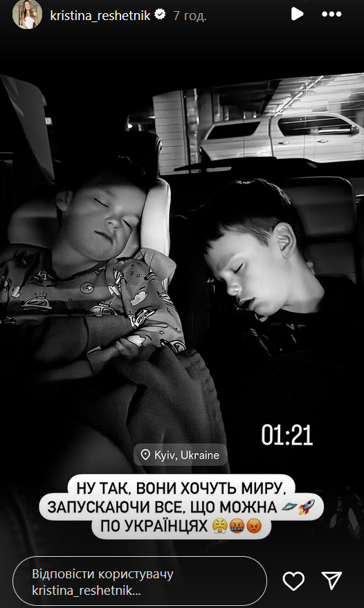 Сім'я Решетніків цієї ночі ховалася у паркінгу. Дружина ведучого "Холостяка" показала сплячих дітей в автомобілі та написала, не приховуючи свою злість на росіян: "Ну так, вони хочуть миру, запускаючи все, що можна по українцях".