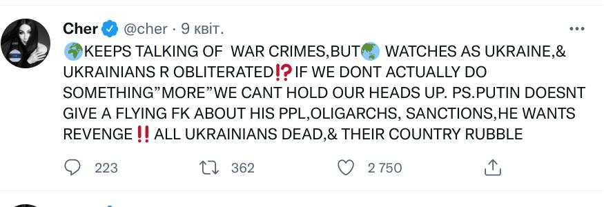Серед безлічі закордонних знаменитостей, які підтримують Україну, співачка Шер говорить не лише про біженців та жертви серед мирного населення, а й про військову допомогу для нашої країни. У Twitter 75-річна зірка закликала озброїти Україну та попередила світ про наслідки нерішучості.
