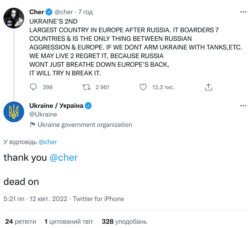 "Україна - друга найбільша країна в Європі після Росії. Вона межує з сімома країнами, і вона єдина стоїть між російською агресією та Європою. Якщо ми не озброїмо Україну танками і т.д, ми шкодуватимемо про це все життя. Тому що Росія не просто дихатиме Європі в спину. Вона спробує зламати її", - написала Шер.