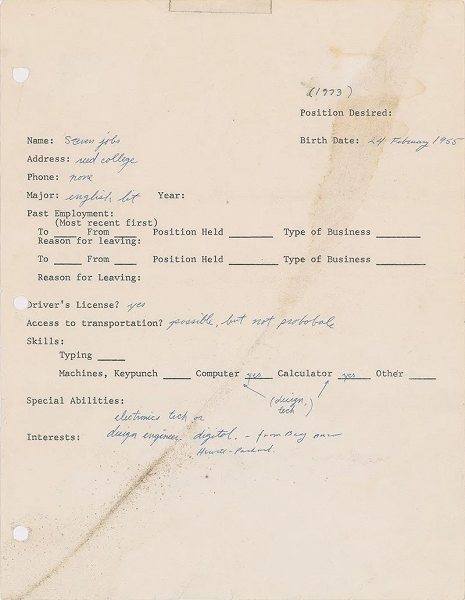 18-річний Джобс написав резюме у 1973 році, і воно є однією з перших спроб знайти роботу після того, як він кинув коледж Рід у Портленді. В анкеті студент написав, що хоче бути "інженером з електроніки або проектувальником", а також підкреслив досвід роботи з "комп'ютерами та калькуляторами". Хоча в гуманітарному коледжі його спеціальністю була англійська література, в графі особливі здібності Джобс написав: "технічний інженер або конструктор - цифровий".