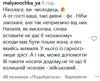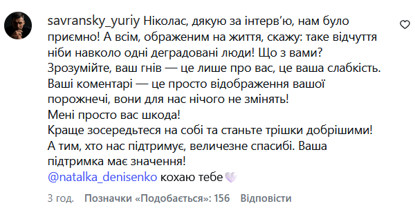 "Ніколас, дякую за інтерв’ю, нам було приємно! А всім, ображеним на життя, скажу: таке відчуття ніби навколо одні деградовані люди! Що з вами? Зрозумійте, ваш гнів - це лише про вас, це ваша слабкість. Ваші коментарі - це просто відображення вашої порожнечі, вони для нас нічого не змінять! Мені просто вас шкода! Краще зосередьтеся на собі та станьте трішки добрішими! А тим, хто нас підтримує, величезне спасибі. Ваша підтримка має значення! Наталко, кохаю тебе", - підтримав Юрій кохану у коментарях.