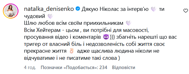 Акторка вирішила не ігнорувати зауваження. У коментарях Наталка подякувала Ніколасу за інтерв'ю, "послала любов" прихильникам і з іронією звернулася до хейтерів.