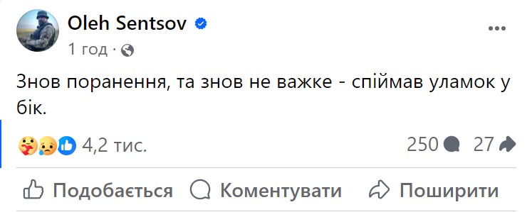 Український режисер, командир взводу 47 омбр "Магура" Олег Сенцов отримав чергове поранення на фронті. У соцмережах він повідомив, що уламок влучив йому в бік. На щастя, травма виявилася не важкою.