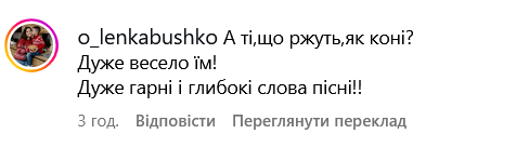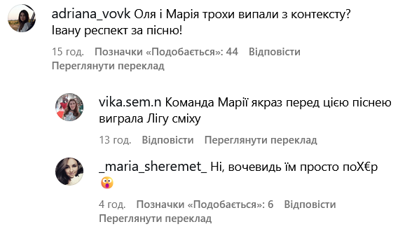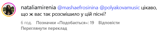 "Дуже розчулила пісня Івана Люленова. І впродовж цієї пісні стало зрозуміло, хто в якому світі живе. Ефросиніна з Поляковою явно в своєму, де їм радісно і смішно. А потім Маша відверто не розуміє, чому її так хейтять";