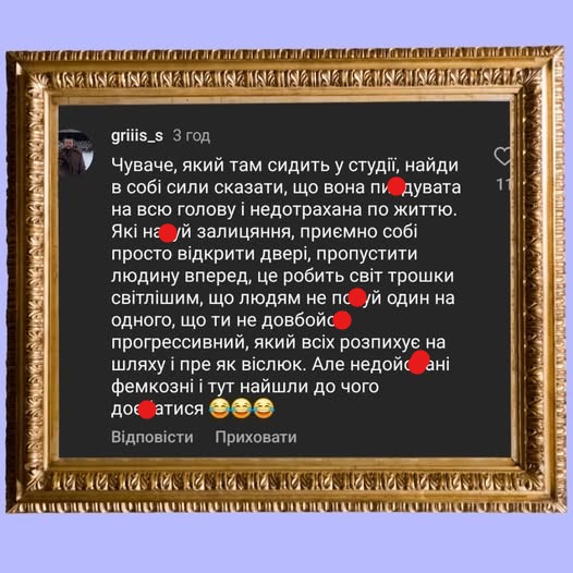 "Чуваче, який там сидить у студії, найди в собі сили сказати, що вона п***увата на всю голову і недот***ана по життю. Які на**й залицяння, приємно собі просто відкрити двері, пропустити людину вперед, це робить світ трошки світлішим, що людям не п***й один на одного, що ти не довб***б прогресивний, який всіх розпихує на шляху і пре як віслюк. Але нед***бані фемк**ні і тут найшли до чого до***тися", – написав в коментарях griiis_s.