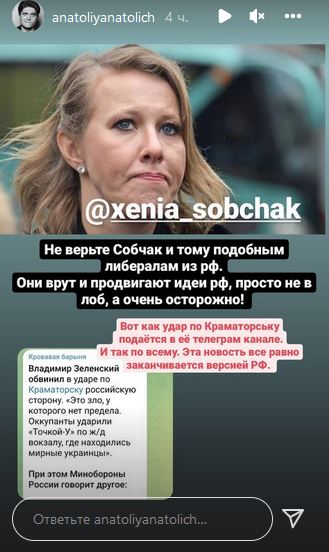 Анатолій Анатоліч навів приклад, як у Telegram-каналі Ксенії Собчак подається новина про ракетний удар по Краматорську.