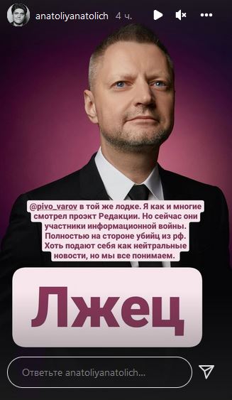 "Це означає, що ця темрява вже торкнулася їх, як у Венум, і вона вже заразила їх, - написав він в Instagram. - Не буває трохи. Не вірте нічого, що говорять із Росії. Це точно буде брехня, або підведення до чогось поганого у найближчому майбутньому".