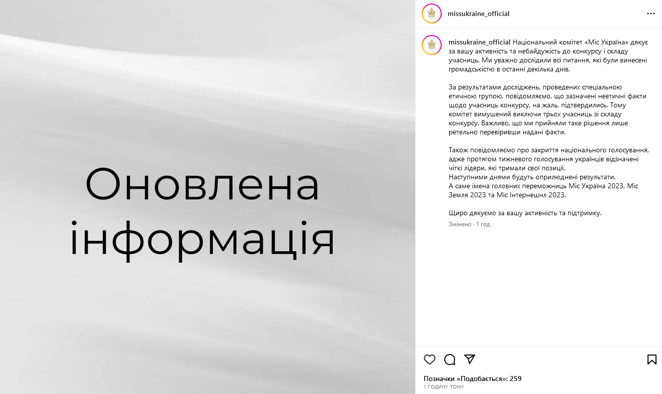 "Національний комітет "Міс Україна" дякує за вашу активність та небайдужість до конкурсу і складу учасниць. Ми уважно дослідили всі питання, які були винесені громадськістю в останні декілька днів. За результатами досліджень, проведених спеціальною етичною групою, повідомляємо, що зазначені неетичні факти щодо учасниць конкурсу, на жаль, підтвердились. Тому комітет вимушений виключи трьох учасниць зі складу конкурсу. Важливо, що ми прийняли таке рішення лише ретельно перевіривши надані факти", - йдеться у новій заяві.