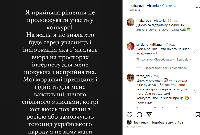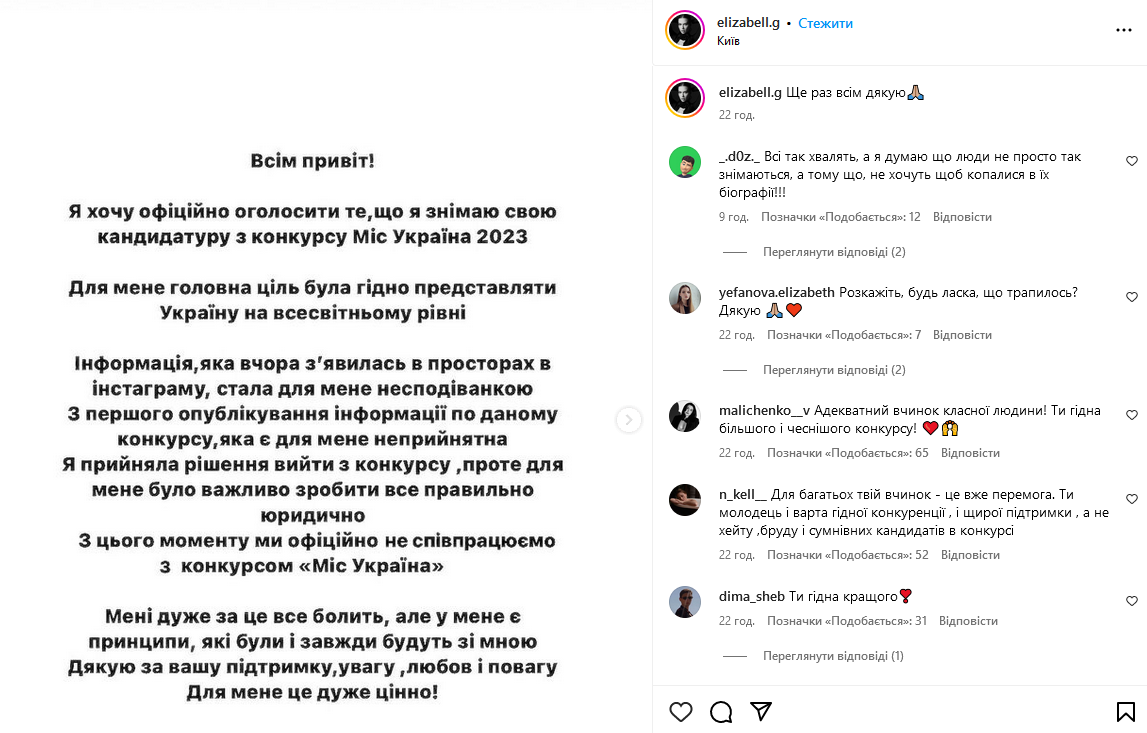 Вже відомо, що танцівниця балету Макса Барських Єлизавета Гончар та модель Вікторія Макарова зняли свої кандидатури з конкурсу "Міс Україна 2023". У всякому разі, таку заяву вони зробили в соцмережі.